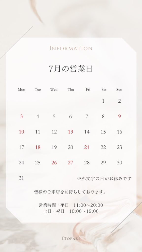 皆様こんにちは。7月 営業日のご案内になります☘️※赤文字が定休日です 営業時間... 森田 麻琴