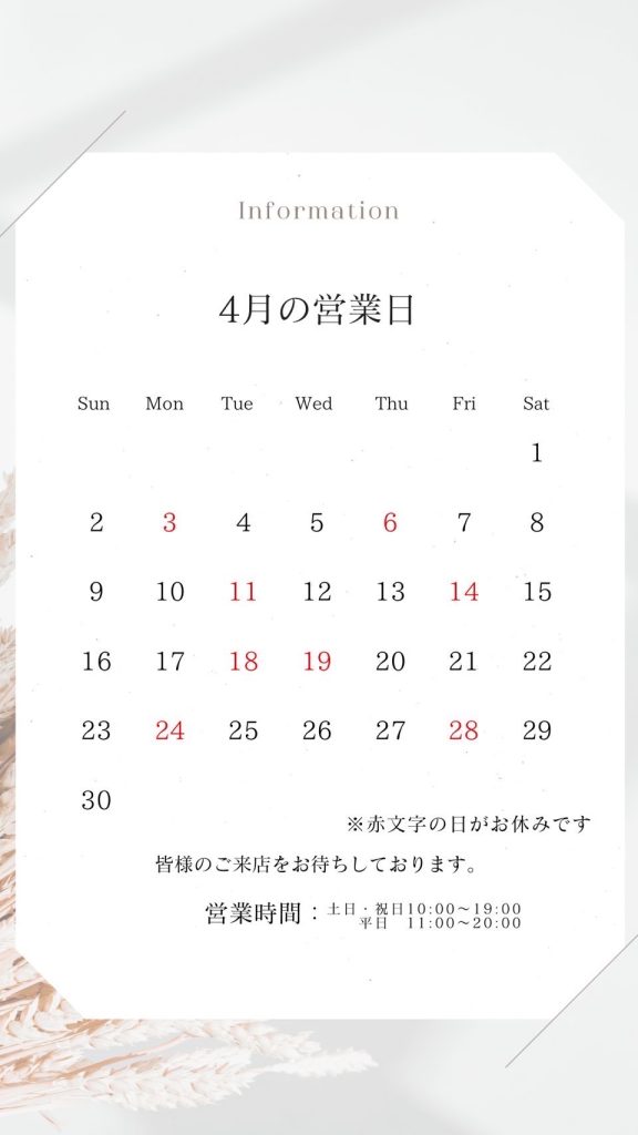 いつも当店をご利用くださりありがとうございます! 4月営業日のご案内です!営業... 森田 麻琴