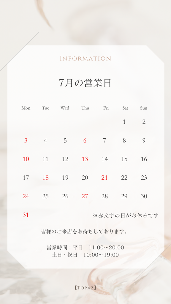 こんにちは^ - ^Topazです!6月の営業日になります! 6月もご来店お待ちしておりま...
